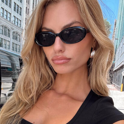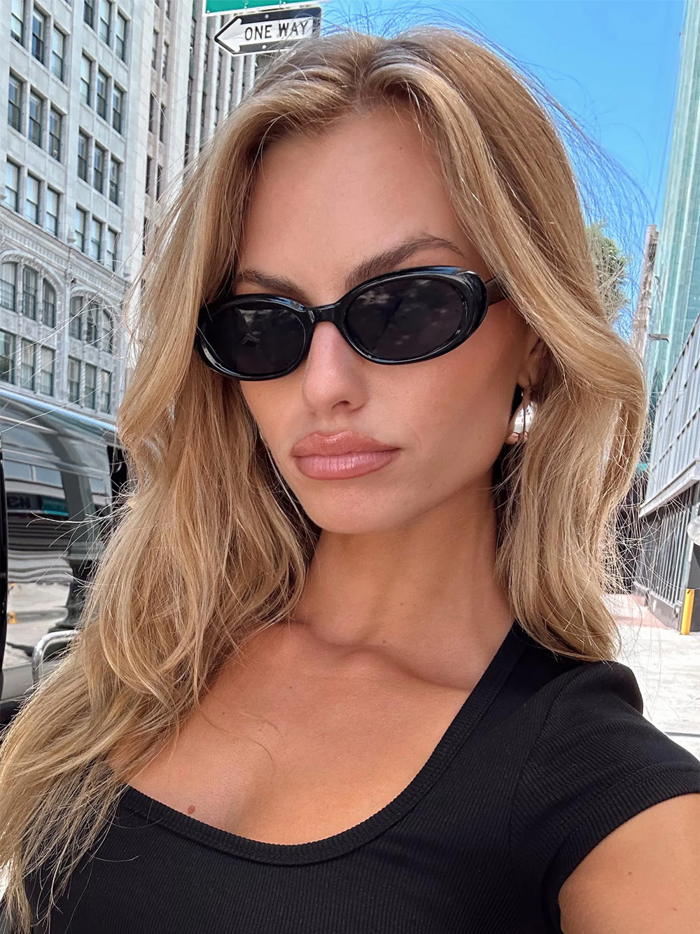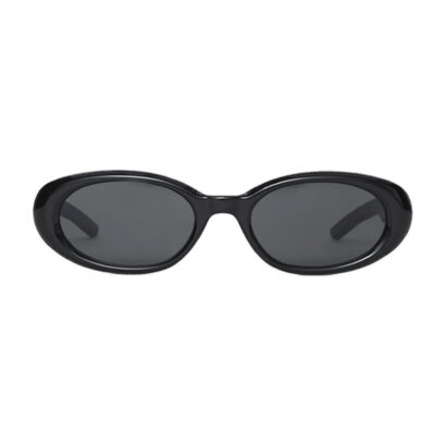 Sunglasses with a moulded nose bridge, smoke tinted lens, thin arms