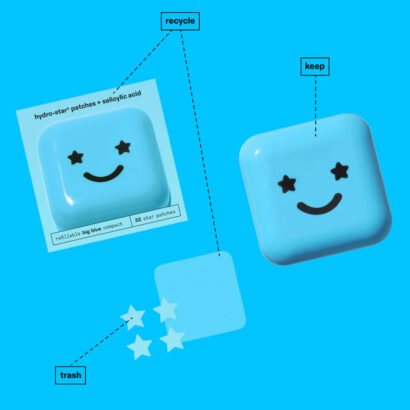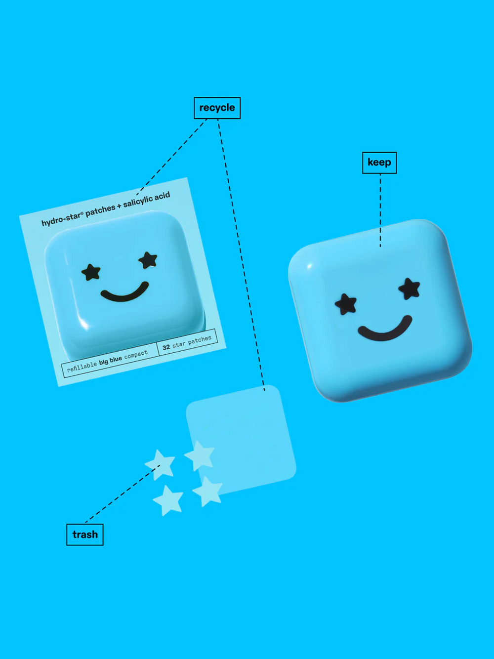 have fun shrinking spots and feeling cute with 32 hydro-star® + salicylic acid patches inside a mirrored, blue compact.