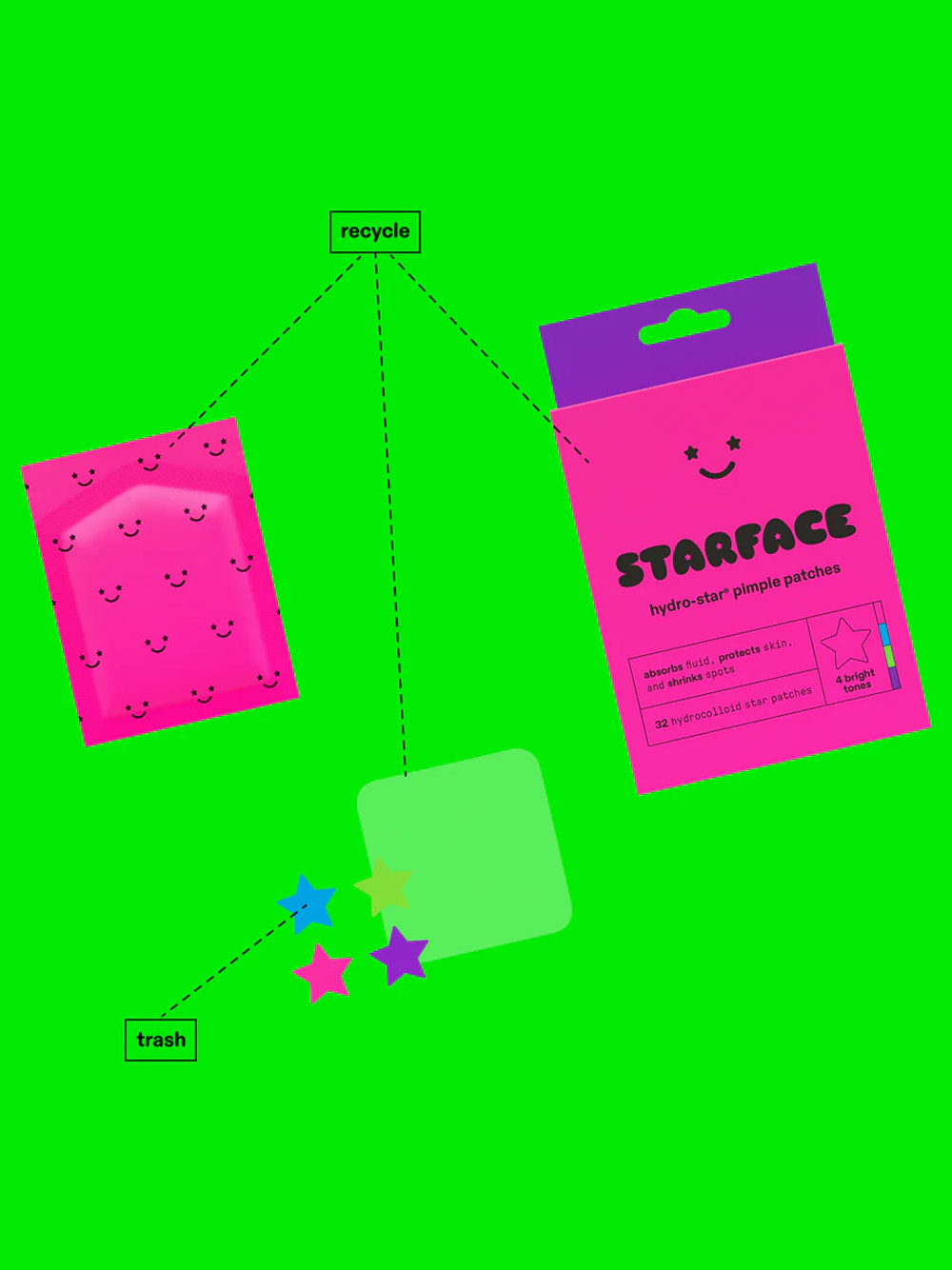 have fun shrinking spots and feeling cute with 32 hydro-star® pimple patches in four bright colors:aqua, lime, azalea, and violet.